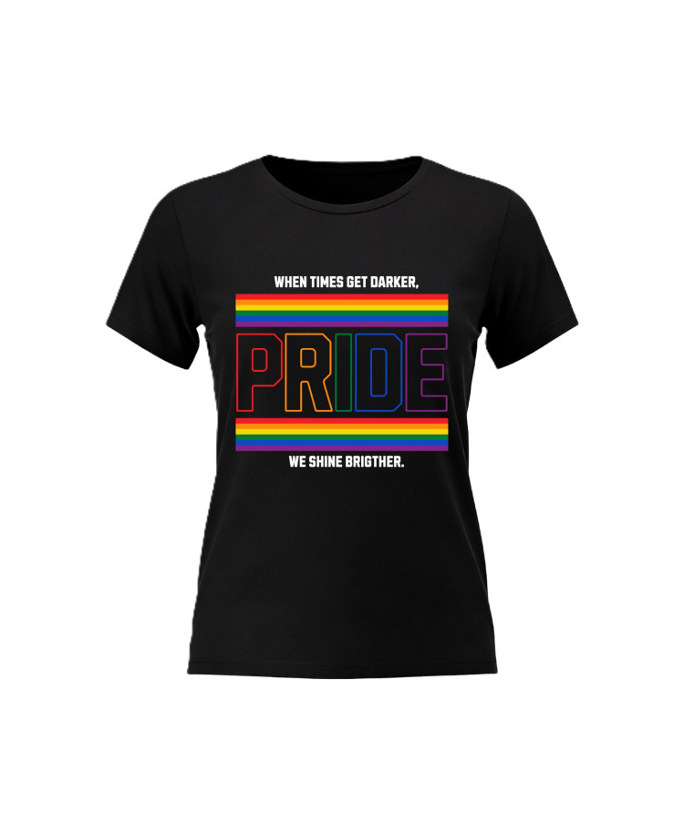 The Shine Brighter – Black PRIDE T‑shirt delivers a bold, high‑contrast look with its rainbow‑filled PRIDE lettering and uplifting message.