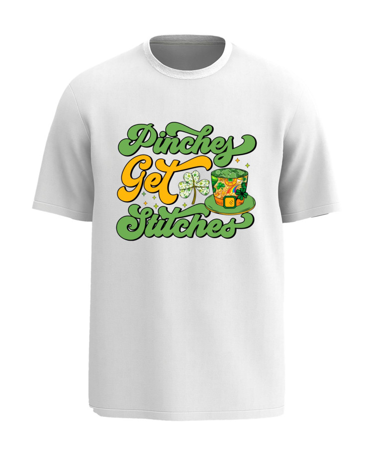 This St. Patrick’s Day T‑shirt features a bold and humorous “Pinches Get Stitches” design in bright green and yellow lettering.