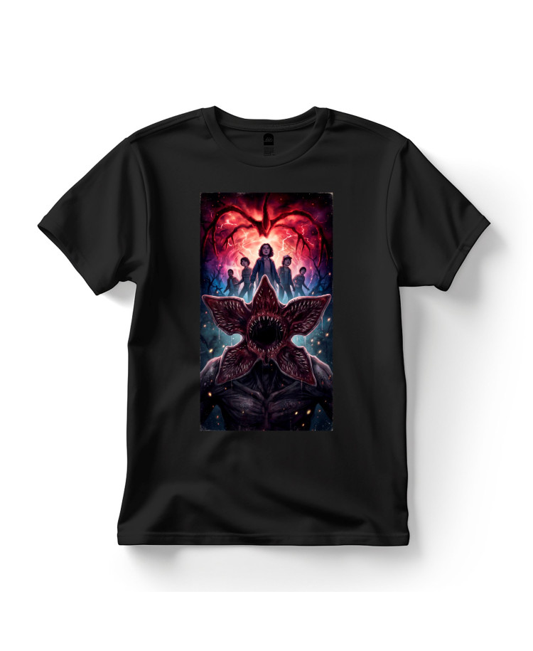 This printed T‑shirt features the Demogorgon standing in the foreground with its mouth fully open, revealing its terrifying, flower‑like maw.