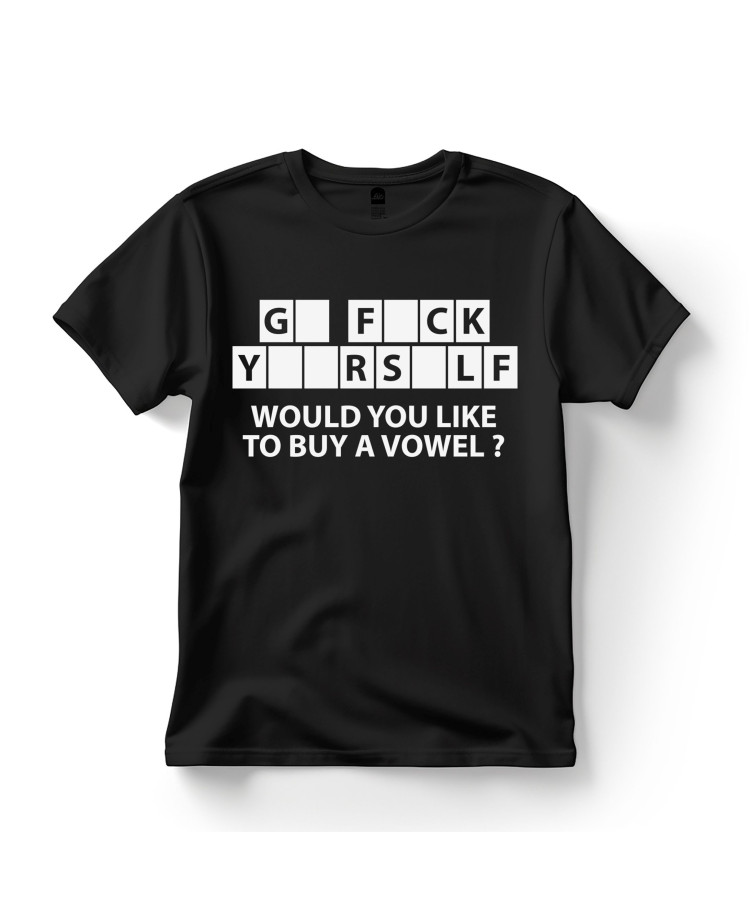 This printed T‑shirt features the sarcastic caption “Would you like to buy a vowel?”above a puzzle‑style word layout